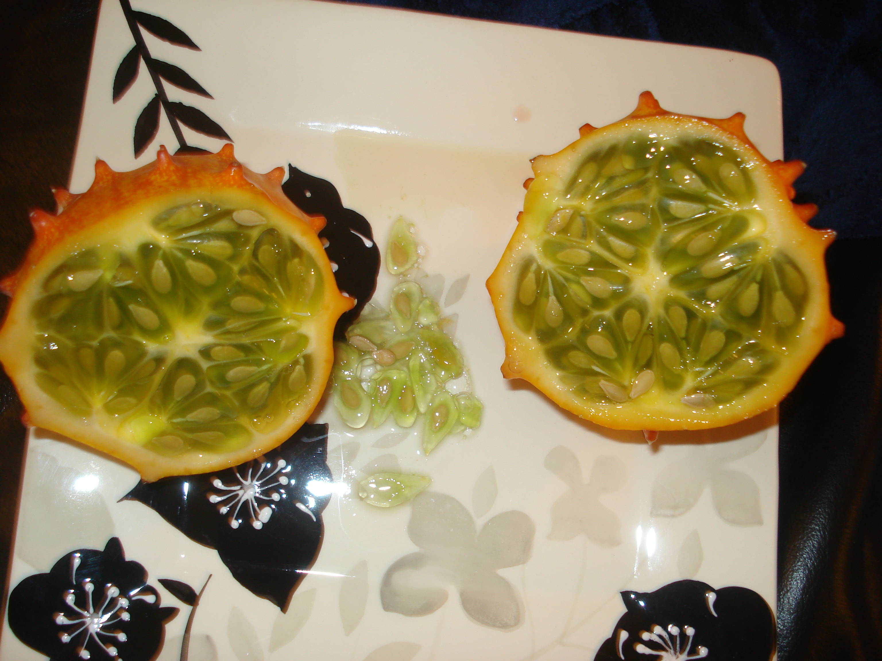 When I got home, I jumped on Google and soon discovered that this strange spiky fruit is called the horned melon, also known as the kiwano melon. It is native to Africa, but is also now grown in California, Chile, Australia, and New Zealand, too. It is apparently rich in Vitamin C and fiber. The skin is edible, but most people eat it by cutting it open and slurping up the pulpy insides. So that’s what I did: