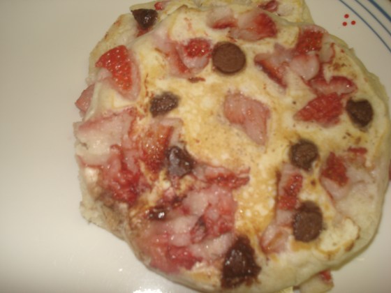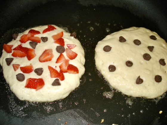 4. If desired, drop in the chocolate chips and strawberries. I prefer to cook chocolate-chip pancakes and add the strawberries on top after.