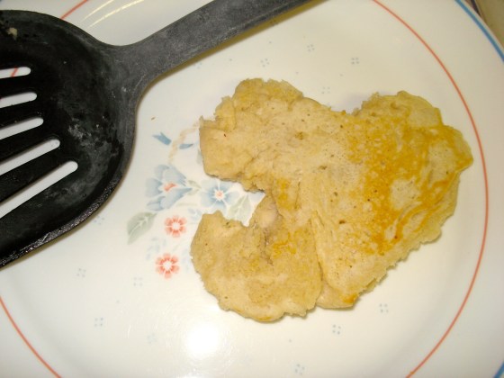 Whenever I make pancakes, my first batch is nearly always a hot mess. Still tastes good, but not as pretty as the others. At least this one kinda looks like a heart! ❤