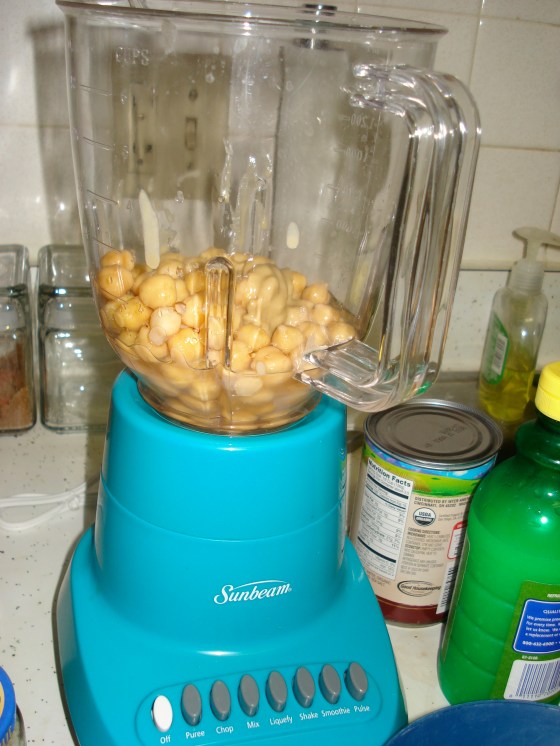 1. In a blender, or by hand, chop the garlic. Pour garlic and garbanzo beans into blender.