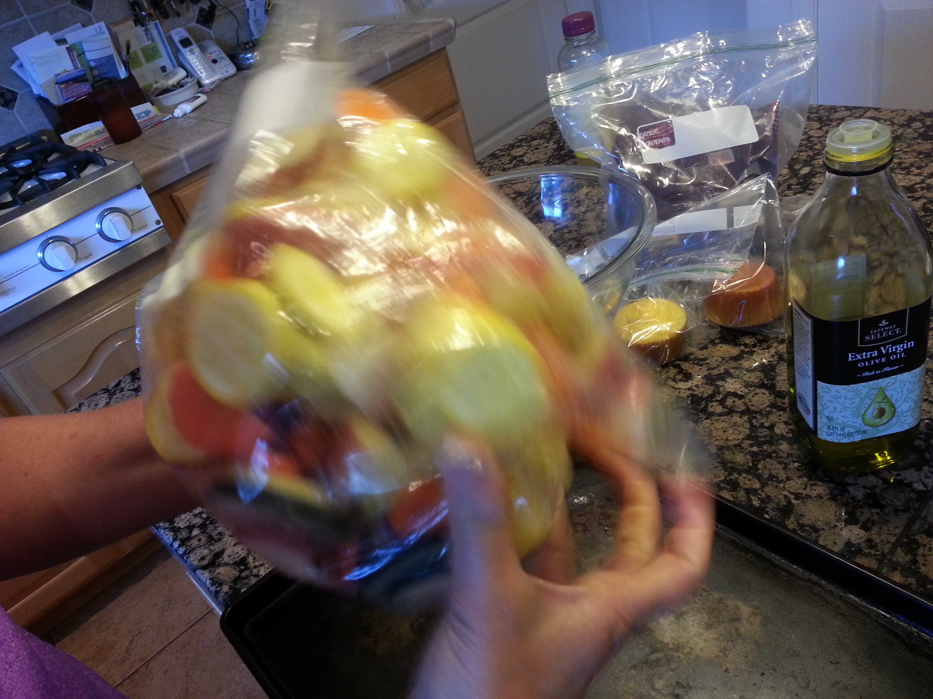 4. Zip closed and shake well until all the goodies are lightly coated with olive oil.